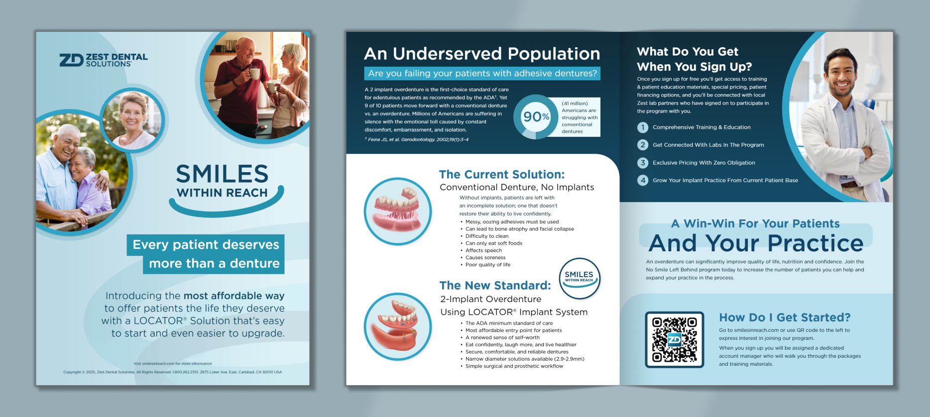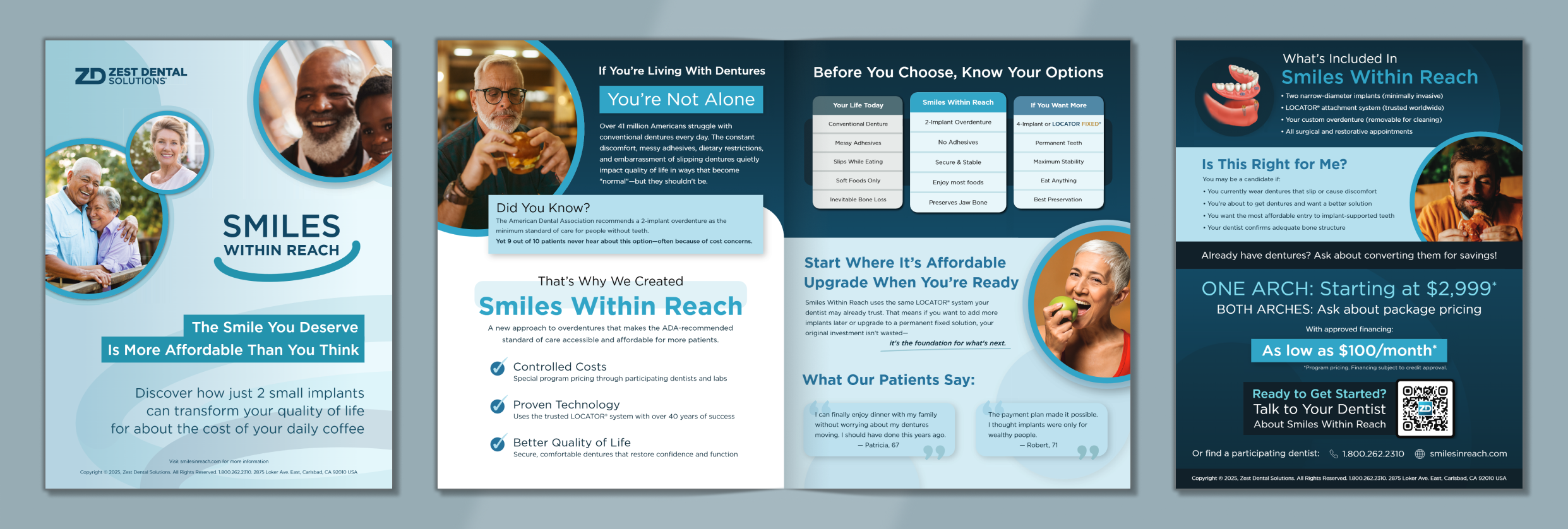 "Smiles Within Reach" was a bifold brochure I designed two versions of. One clinical facing for dentists and another patient facing that dentists could hand directly across the chair. It introduced implant-supported solutions to patients who might never have known they were an option. It was designed to start a conversation the dentist had just been trained to have.