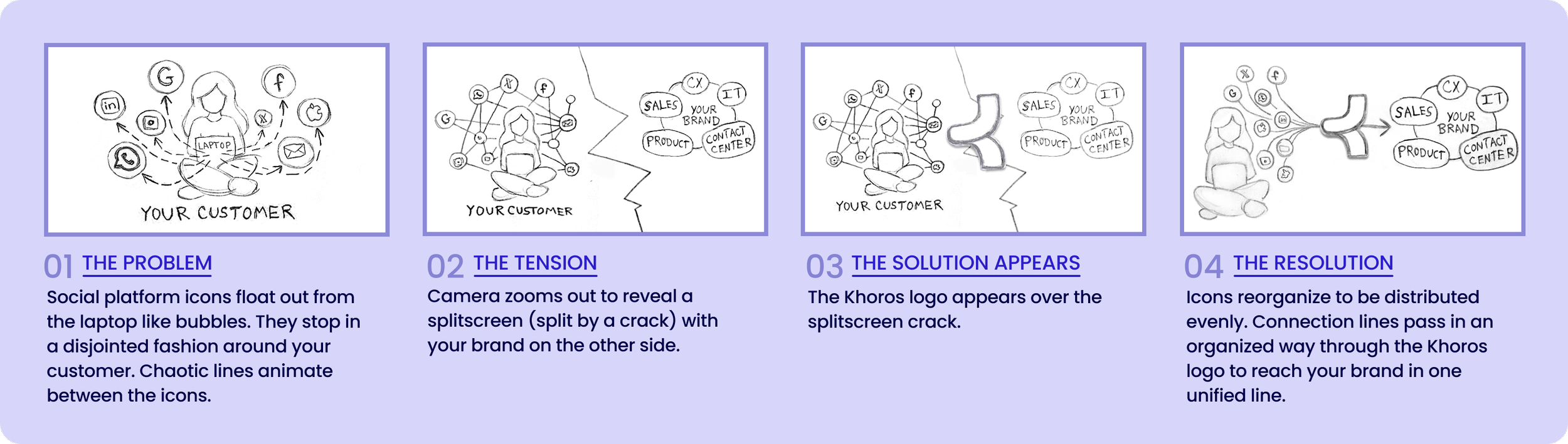 Before opening any design software I sketched a storyboard and ran it by subject matter experts at Khoros to verify I was telling the right story and not just a visually satisfying one. Technical accuracy and emotional clarity are both required. If the story didn't land in rough sketches, it wouldn't land in polish.