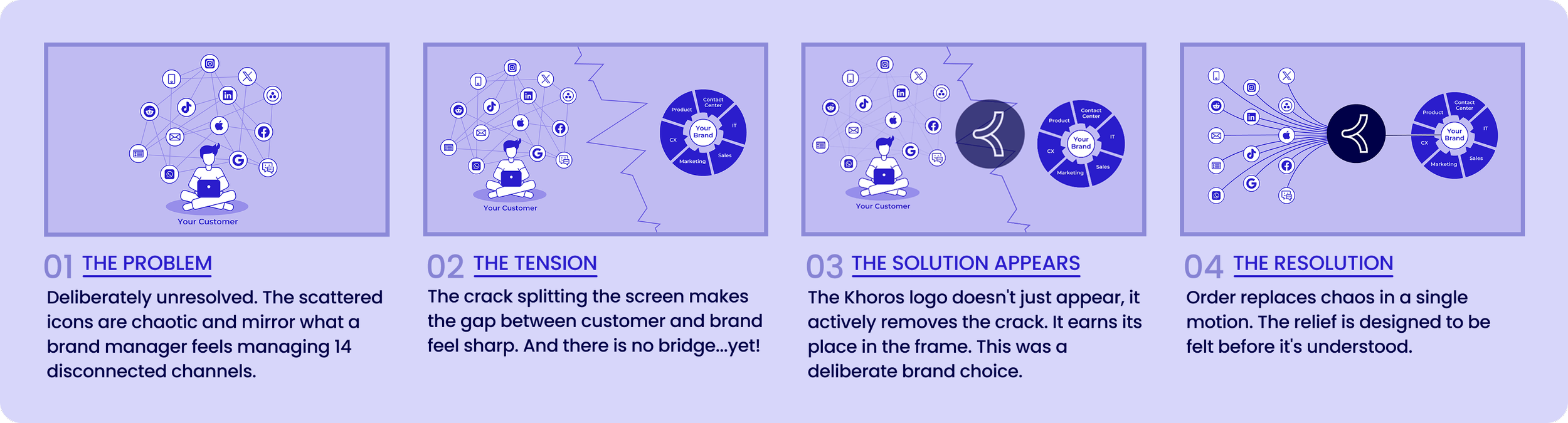 The old diagram is cluttered. As a static image it struggles to tell an inherently sequential story. Chaos doesn't become order in a frozen frame. The whole point of Khoros is that it transforms a fragmented, overwhelming situation into something unified and calm. That transformation is best communicated in motion.
