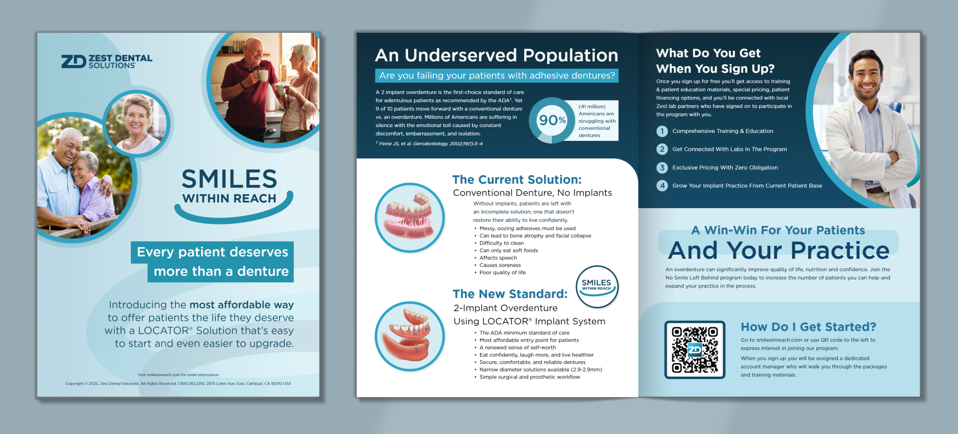"Smiles Within Reach" was a patient-facing trifold dentists could hand directly across the chair — introducing implant-supported solutions to patients who might never have known they were an option. It was designed to start a conversation the dentist had just been trained to have.